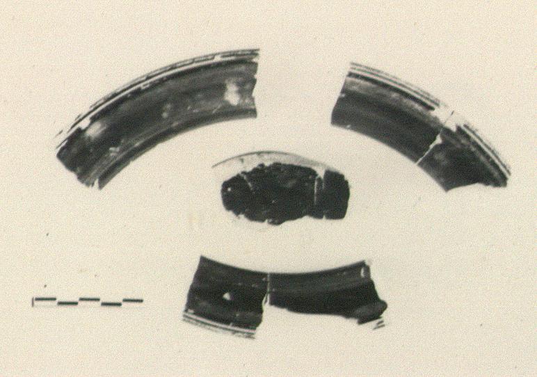 | Description: | Four fragments, three from the rim and one from the floor with part of the foot, from a large elaborately moulded plate. Flat floor; broad ring foot with a ridge around its inner edge; low convex rim, finished with a heavily moulded raised edge; miltos groove around its upper surface, and another below the rim outside, and a third at the junction of floor and rim. Good glaze, a little thin on the rim. | |