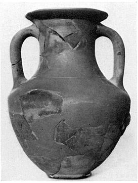 | Description: | Much missing; no join between neck and body fragments, but profile can be restored. Made up in plaster, without foot. Plump eggy body on ring foot, the wall forming an angle with the shoulder; continuous concave curve from below lip to shoulder angle. Broadly projecting lip, flat on top. Thick band handles, from below lip to near edge of shoulder. Single wheel run groove around shoulder above handle attachments. Sandy buff clay, gray at core. | |