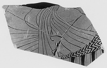 | Description: | From the wall of a column krater; streaky black inside. Preserved is the midpart of a partly draped figure, reclining to left on a cushioned couch. Dilute glaze for muscles; no relief contour. | |