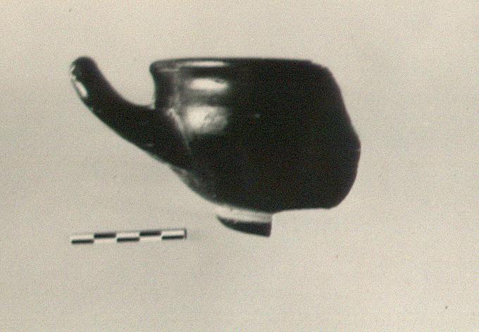 | Description: | A single fragment preserves profile to floor and one handle. Low heavy torus ring foot; bulging wall, concave rim with slightly thickened lip; stout uptilted handle. Reserved: handle space and inside of handle; line at junction of foot and wall; resting surface; and space inside ring foot (trace of glazed circle at break). A purple line, inside and out, at junction of wall and rim. Inscribed in the handle space: <graphic> Dull black glaze. | |