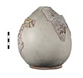 | Description: | Four fragments preserve parts of the wall and shoulder and the base of a round-bodied, narrow-necked jug with ring foot. No join between wall and base fragments. On b) the lower handle attachment. Decoration in applied relief of leaf sprays with berries and tendrils; a small bird perched on one tendril; an ivy leaf under the handle attachment; a ring of small dots around the base of the neck. ADDENDA Joining fragment added from tin 115 in 1952, serves to unite frags. b) and c). Description added by JWH in Sept. 2007: Large parts of both sides of body (part-mended, now restored); whole of base (connection with body fragments now lost). Handle missing except for lower attachment. Low-bellied plump ovoid body; at top, groove/offset around stump of a narrow neck. Low footring. Fine incisions around body at handle-base at belly and immediately above footring (guidelines for applied elements?). Clean-textured brown ware (medium thickness, neatly polished). Creamy white slip, yellowish tint in places, from storage (?) covering exterior with drips on interior. Slip ends at base, only splashes on bottom. Neat barbotine decoration (part-moulded, with added dots) covering most of exterior (to bellow belly). Decoration (under the slip): row of dots around neck-base; large downturned ivy-leaf (mould-applied?) on handle-base. Large upright palmette-like leaf-spray (11-leaf(?), with small 'ribbons' tieing base) on belly opposite handle, from which issue slender undulating stems curling around belly, with leaf-sheathes and with curling leaf-sprays and triple berries (part-moulded elements) emerging above and below on slender stems. Rows of tiny barbotine dots applied to some of the leaves. A small bird motif (part-moulded, part-barbotine?), perhaps one of a matching pair, perched on one of the lateral stems. Unique. Cf. RG barbotine ware series. Augustan period or a little later (ca. 20 B.C.-20/30 A.D.?). Find context probably pre-AD 40/50. | |