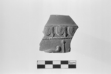 | Description: | Fragment from a bowl or open pot; broken all around; glazed inside. Outside, moulded decoration: large egg and dart band in relief; below it, a star on a pole, and an animal's tail(?). Thick fabric of fine red clay; thick red glaze, rather dull, and inclined to chip outside. | |