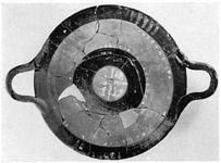 | Description: | Small piece of rim and part of floor missing. Nearly flat plate on low raised base; plain rim. Two horizontal band handles attached at edge of rim and tilted above it. A broad glaze band around outer edge of floor and another near center; handles glazed; exterior plain. White bars on the outer glaze band, then a ring of dots; a second ring of dots just outside the inner glazed band, and traces of some ornament on the band. At the center, a cross with filled angles. Buff clay, in part burned gray; dull black glaze, worn. | |