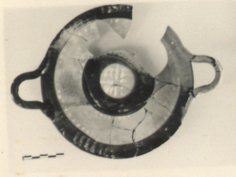 | Description: | Small piece of rim and part of floor missing. Nearly flat plate on low raised base; plain rim. Two horizontal band handles attached at edge of rim and tilted above it. A broad glaze band around outer edge of floor and another near center; handles glazed; exterior plain. White bars on the outer glaze band, then a ring of dots; a second ring of dots just outside the inner glazed band, and traces of some ornament on the band. At the center, a cross with filled angles. Buff clay, in part burned gray; dull black glaze, worn. | |