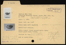 | Description: | About half remains. From a small black glazed kylix base. Incised on top: <graphic> and on underside: <graphic> Black glaze much flaked. | |