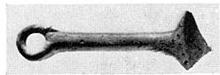 | Description: | Straight projecting rolled handle with a loop at the end. Probably from ladle or frying pan The shallow round concave bowl broken off. Small impressed rings at base of handle and in bowl. Fine cooking ware fabric. [Ladle AE] | |