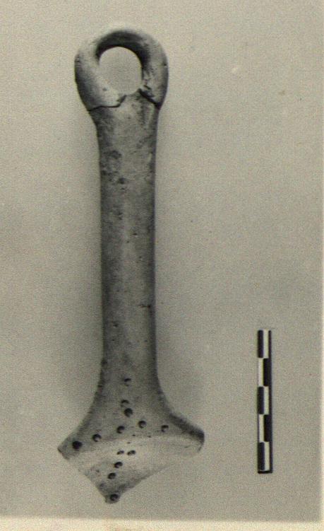 | Description: | Straight projecting rolled handle with a loop at the end. Probably from ladle or frying pan The shallow round concave bowl broken off. Small impressed rings at base of handle and in bowl. Fine cooking ware fabric. [Ladle AE] | |