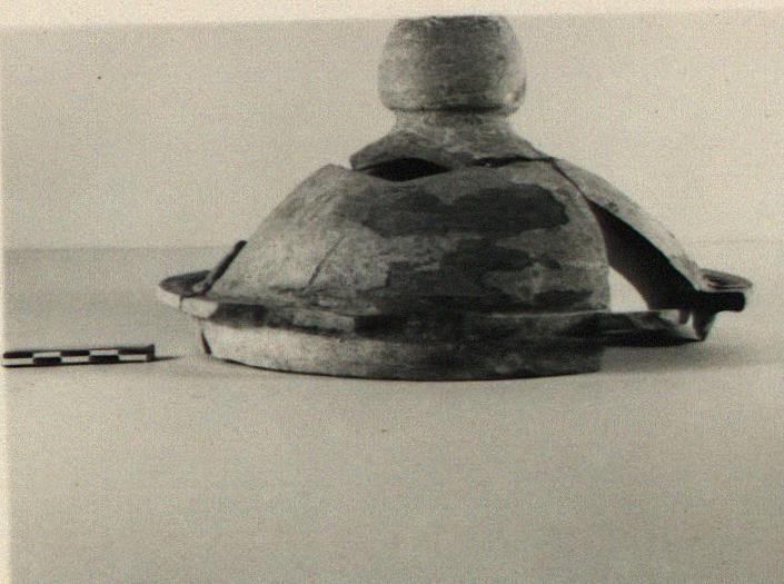 | Description: | The tip of the knob, fragments from the top and about half the rim and flange missing. Restored in plaster. High domed lid topped by a pear-shaped knob and finished below with a narrow horizontal rim and a vertical flange. Painted decoration: on the knob, narrow red and black bands; on the top, from the knob down, a black, a red, and a pink band; then a large bead and reel band in red; below, just above the rim, a black band and on the rim red blobs. Possible traces of red bands on the flange. All much worn. Brown slightly micaceous clay, covered outside with a white slip. | |