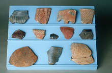 | Description: | Two joining fragments from the wall of a closed pot. Gritty reddish-brown clay, gray at core. Inside slipped; outside cross-hatched in alternate red and white stripes. | |