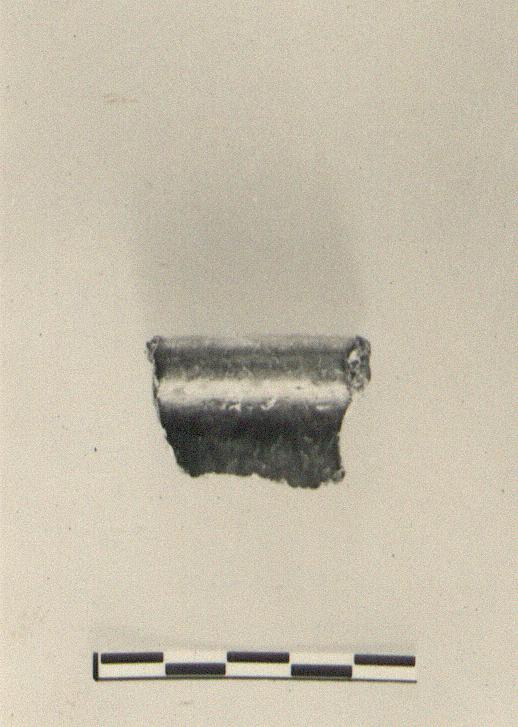 | Description: | Fragment of steep wall and rim rolled toward inside. Gritty clay, gray throughout; mottled black and brown burnished slip inside and on rim. | |