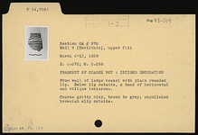 | Description: | From the wall of a large vessel with plain rounded lip. Below lip outside, a band of horizontal and oblique incisions. Coarse gritty clay, brown to gray; unpolished brownish slip outside. | |