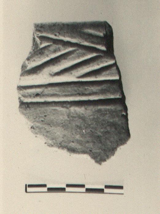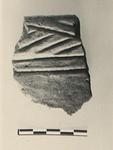 | Description: | From the wall of a large vessel with plain rounded lip. Below lip outside, a band of horizontal and oblique incisions. Coarse gritty clay, brown to gray; unpolished brownish slip outside. | |