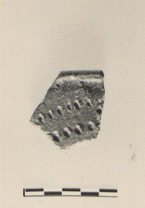 | Description: | From large pot with straight wall and slightly flattened rim; bands of incised dots on wall. Gritty dark brown clay. | |