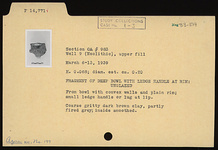 | Description: | From a bowl with convex walls and plain rim; small ledge handle or lug at lip. Coarse gritty dark brown clay, partly fired gray; inside smoothed. | |
