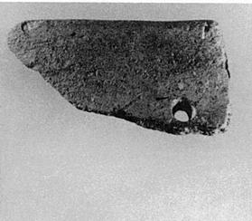 | Description: | From the vertical rim of a large jar. A string hole at base of rim. Gritty pinkish-brown clay, gray at core; roughly slipped inside and out. | |