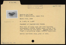 | Description: | From the wall of a large open pot with lug-like arrangement (mostly broken away) rising from rim, pierced by five holes. Inside, below the lug, a projecting ledge, double, unpierced. Gritty red-brown clay, gray at core. | |