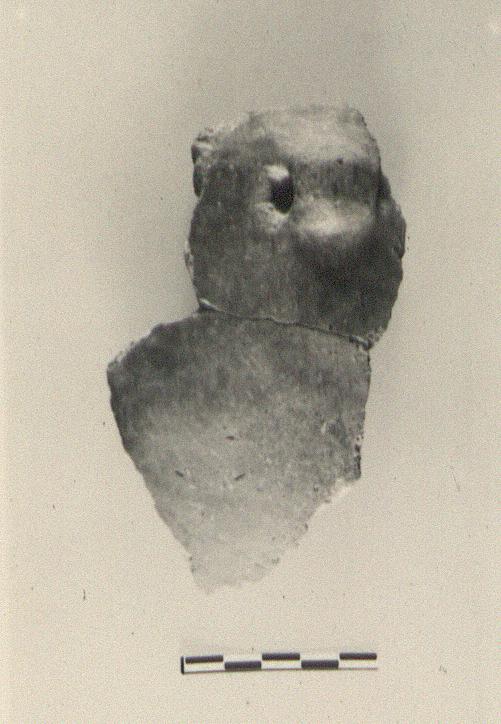 | Description: | From a deep bowl with plain lip; horizontally pierced lug just below rim. Gritty brown clay, gray at core; good red burnished slip inside and out, worn inside, where there are apparently traces of striped decoration. | |
