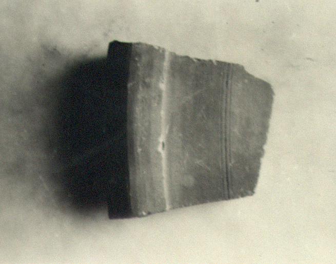 | Description: | From the rim of a large flat plate? The heavy rolled edge provides a rim above and a very low foot below. On underside, near outer edge, three inscribed concentric circles. Fine red clay covered above and on edge by red wash. Late Roman. | |