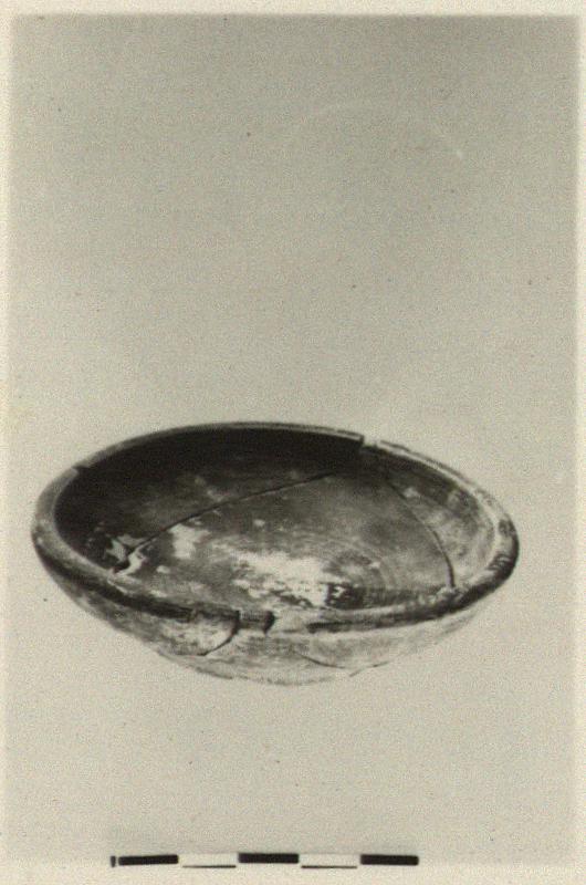 | Description: | Mended from several pieces; complete except for chips. Small shallow saucer with plain upturned rim and flat bottom. Coarsely made; wheel marks on bottom. Dull thin black glaze, much peeled. | |