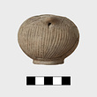 | Description: | Small fragments of body and rim restored. Round-bodied pot on ring foot; two lug handles, pierced by string holes, at the rim. The body grooved vertically, from foot to shoulder, on the shoulder, incised decoration of double zigzag; incised zigzag also on lid, and checkerboard on flattened top of knob. Leaf-shaped lid, pierced near the ends to correspond with string holes on body. Fine clay, with slightly burnished surface. Handmade. | |