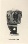 | Description: | Mended from many pieces; part of foot, much of back part of body, handle and neck missing. Broad-shouldered lekythos, shoulder sloping up gently towards neck. Body tapers sharply to bottom; moulded ring at junction with foot. Broad disk foot, nearly flat below; outer face flaring, slightly concave and finished below with small torus. Around base of neck, tongues; on shoulder, five palmettes with a lotus bud either side of the handle. Figured scene of five personages: at left, a gray-beard, cloaked and seated right, holding a cross-topped staff. Beyond a Doric column stand a man and woman embracing; the man wears a himation, the woman chiton, himation and sakkos. A second column separates this pair from another, who stand facing each other, each holding a flower; their dress is apparently similar; much of the lower part of the figures is missing. A third column closes the scene at the right. Double row of linked dots between pairs of glaze bands above scene; below, single ground line, then two red bands bordering a black; then a reserved band, and a line of red along the top of the black below. Red also around outer edge of top to foot; edge and underside of foot reserved. Added white for women's flesh, for hair and fillet of man at left, for fillet(?) of man in central group and for dots on garments. Added red for beard and front hair of man in right hand group, and for dots on garments. | |