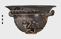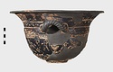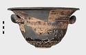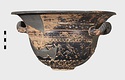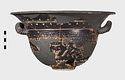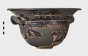 | Description: | Fragmentary; more than half of the walls preserved, but none of the lip. A large bowl with typical Megarian decoration, to which a base (small ring, perhaps not complete, preserved) and a flaring wheelmade rim have been added. At the junction of the two, on the line of the twisted horizontal handles, a scraped groove colored with miltos. Bowl: bottom, central rosette, from which rises an imbricated leaf pattern; central band, young satyrs with winged horses, in the field large goat masks; upper border, bands of egg and dart, dots, and small palmettes above spirals. Rim: painted inside and out in white and clay-colored paint ("west slope style"). Ivy pattern on both sides of a white band, outside; inside, pendent drops and garlands, in clay color with remains of white. On the bottom, inside, a scraped circle (Diam. ca. 0.11m.) enclosing four lines of clay color intersecting at the center. Good metallic black glaze inside and out, somewhat worn on the outside. | |