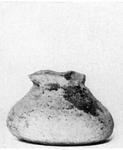 | Description: | Handle missing. Low squat body, trefoil lip; slightly indicated base, left rough from wheel. Dull black glaze on outside and on interior of mouth; badly worn. Flaky buff clay. | |
