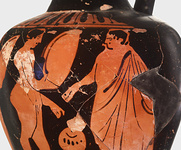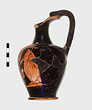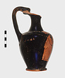 | Description: | Mended from several pieces. Most of the trefoil lip and much of the right side of the body missing. Egg-shaped body; flat bottom, projecting; narrow neck; handle round in section attached so as to form a large projection on the upper face of the lip. Tongues between bars on shoulder at front. Below, three youths; he at the left, cloaked, facing right and holding a large tympanum(?); he in center, nude, also right, and holding a similar object; he at the right, cloaked, facing left, and holding a large aryballos. Thick glaze, except under foot and below neck inside. The background glaze has slopped over the tongue pattern at the right above. | |