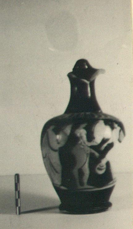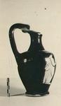 | Description: | Mended from several pieces. Most of the trefoil lip and much of the right side of the body missing. Egg-shaped body; flat bottom, projecting; narrow neck; handle round in section attached so as to form a large projection on the upper face of the lip. Tongues between bars on shoulder at front. Below, three youths; he at the left, cloaked, facing right and holding a large tympanum(?); he in center, nude, also right, and holding a similar object; he at the right, cloaked, facing left, and holding a large aryballos. Thick glaze, except under foot and below neck inside. The background glaze has slopped over the tongue pattern at the right above. | |