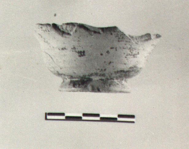 | Description: | A single fragment preserves the heavy ring foot and the lower part of the side, which flares outward toward the top, of a Samian B bowl. Small circular groove at center of floor. Micaceous clay; glaze dark, very much worn. | |