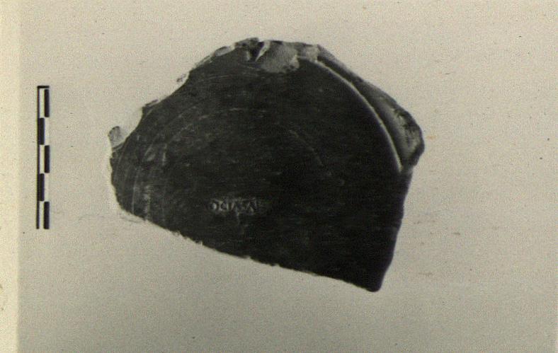 Description:   A single fragment preserves most of the flat floor of a Western Sigillata plate on ring foot, with the start of the wall, lightly set off from the floor inside.