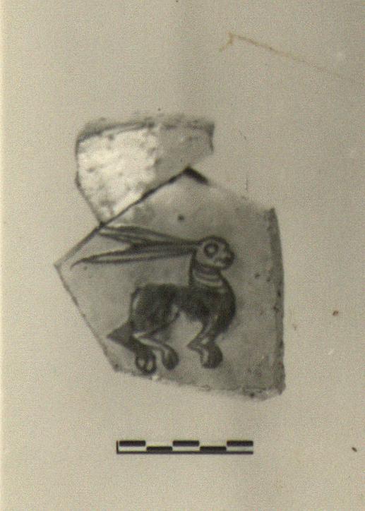| Description: | Low ring foot; center of floor and part of wall preserved. Rabbit, right, body incised, head and ears sgraffito, legs and paws part incised, part sgraffito. Very long ears. Bit of enclosing circle, incised, at edge of break. Thick reddish clay, yellow glaze; white slip on outside. | |