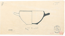 Description:   Broken but complete. Plain black glazed skyphos, flat-bottomed, with reserved band at lip inside and out; inside of handles and handle-spaces reserved. Bottom unglazed.