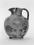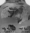 Description:   Mended from many pieces; part of the lip, and much of the body, including most of the figured scene, missing. Oinochoe Shape III. Panel bordered by ovule pattern above and below; narrow reserved bands at sides. Preserved are parts of the feet and lower drapery of two figures, he at the left with a staff.