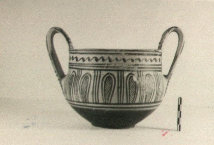 | Description: | Mended from three pieces; complete except for small chips. Broad body on low raised base; broad vertical band handles rising above vertical lip, attached at lip and shoulder. Shoulder and upper body reserved and decorated with tall, narrow hatched blade-like leaves set in vertical panels. Dots in panel either side of handle. Around the lip, zone of linked dots between bands. On the handles, horizontal bands and two crossing diagonal lines. Reserved line at inner edge of lip; bottom reserved. Buff clay; black glaze, worn inside. | |