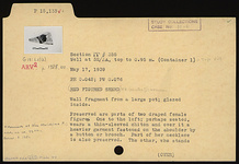 Description:   Wall fragment from a large pot; glazed inside. Preserved are parts of two draped female figures. One to the left, perhaps seated, wears a thin-sleeved chiton and over it a heavier garment fastened on the shoulder by a button or brooch. Part of her necklace is also preserved. The other, who stands behind, facing left, wears a thin Doric chiton. Her right hand is outstretched; in her left is a spray of olive.
