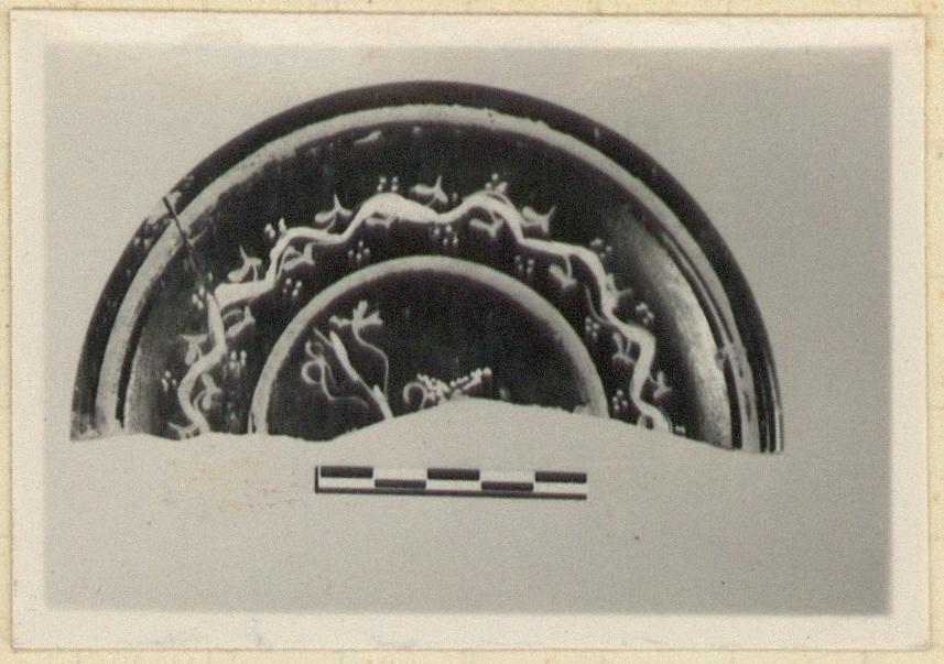 | Description: | Half preserved, mended from two pieces. Hollow plate on ring foot; rim very slightly down-turned. Reserved groove on rim; another on floor over foot. Floral decoration on floor in added white and yellow; at center, vine motif; around outer part, ivy garland. Firm, rather metallic black glaze except for grooves. | |