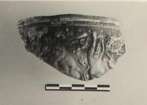 | Description: | A single fragment preserves part of plain slightly thickened rim and vertical side. In low relief on exterior, some figures in violent action. Dull brownish glaze of various shades. ADDENDA At the left and in the center are indications of a tree with very large leaves. At the left also, possibly a figure facing left with his arm around the neck of a crouching man or animal. At the right, a figure (possibly two figures) with upraised arms. | |