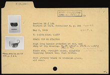 | Description: | High loop handle attached at rim, and chip of lip missing. Handle restored in plaster on model of others in tray. Plain rim, straight sides, slightly tapering toward top; flat bottom. Dull streaky black to brownish glaze, over all. | |