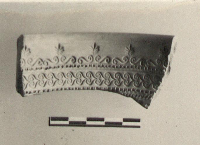 Description:   A single fragment preserves part of rim. Above, palmettes widely spaced; then a band of scrolls and a guilloche between bands of dots.