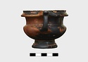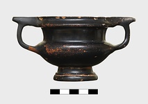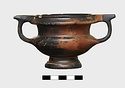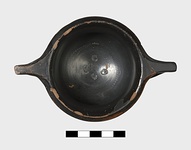 | Description: | One handle and chips missing. Squat type with spurred vertical handles and small doubled rim. Moulded base with miltos groove around outer face and beneath. Rouletting and four stamped palmettes at center of floor. Good black glaze, fired red in part; scraped groove at junction of foot and wall. | |