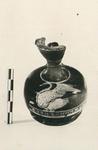 | Description: | Squat lekythos. Part of the mouth missing; otherwise intact. Ring foot; flat shoulder; the neck set off by a light ridge. On a band of egg and dot, a swan, left, with wings raised. In front of the bird a small oval reserved area (accidental, or is it an egg?). No relief contour; firm black glaze; underside reserved. | |
