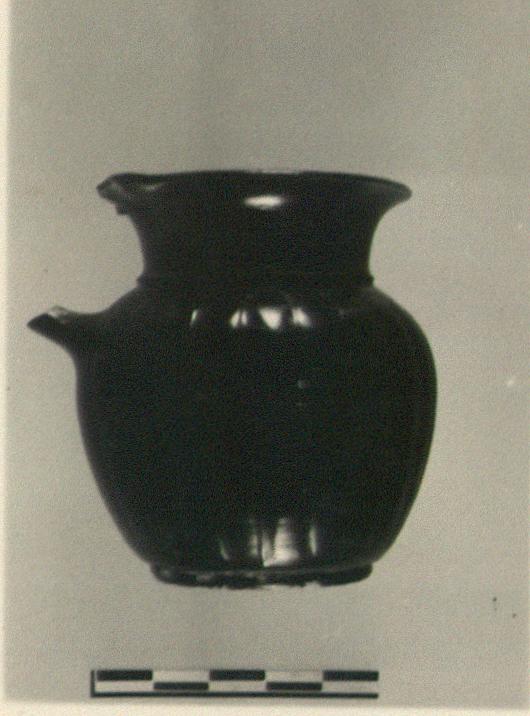 | Description: | Intact except for handle. Ring foot, set off from the wall by a groove; shoulder gently rounded. A nicked ridge at junction of shoulder and neck. Round mouth with out-turned lip. Double rolled handle with shouldering. Very good black glaze all over. | |