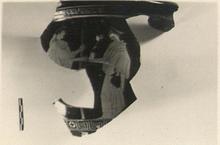 | Description: | Six joining fragments give part of the rim and wall of a bell krater, with a trace of one handle at the right of the fragment. Neatly moulded rim, with egg pattern on lightly offset band, just below. At bottom, maeander, broken by cross squares. Inside, reserved line just below lip and another lower down. Two figures, from a possible three, remain: at right, a standing woman, wearing chiton, himation and hairband, facing left, and holding an oinochoe in her left hand, a phiale in her extended right. Facing her is a standing youth, wreathed, and wearing travelling clothes (chlamys and hanging petasos); he holds a pair of spears in his left hand. Inscribed above, between the two: Κ Α Λ Η No relief contour; dull work but careful. White for the boy's wreath, for the inscription, and for the wine which spills from jug and bowl. Excellent glaze. ADDENDA Much of wall added from sherds, with one handle. At left, a third figure, a man right, wrapped in a cloak and carrying a staff. Eggs around handles; bit of a draped figure on other side. | |