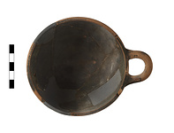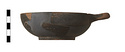Description:   Fragment of flat-topped rim, with one handle, from a black glazed cup; one-handler?