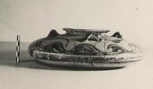 ADDENDA P 15235: Round mouth with out-turned lip. Flat, watch-shaped body. Three small handles on broad shoulder or upper half of body; also wave-like decoration and wavy lines. Concentric circles on bottom.
