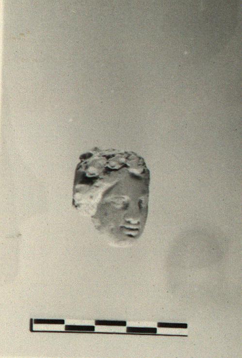 | Description: | Woman's head, wreathed; broken off behind and at neck. Traces of white on face, of black glaze on hair and behind. | |