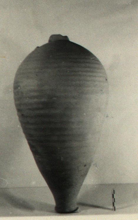 | Description: | Mouth and post of neck and handle missing. Egg-shaped body, pointed toward bottom; narrow neck. Horizontal ribbing on body. Light red to buff clay. Traces of light buff slip. | |