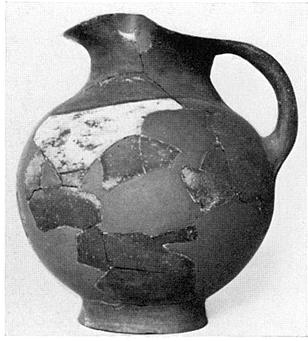 | Description: | Broken all around; fragment from rounded shoulder of closed pot. Around the shoulder, a broad band of added white, bordered at top and bottom by a narrow red band; traces of decoration in red over the white band. Thin gray fabric, apparently not wheelmade. ADDENDA Other fragments added from sherds make up to a plump trefoil oinochoe. Much of body and front of lip missing, but profile complete. High straight ring foot; rolled handle from lip. Gray cooking-ware fabric. The painted band which surrounds the shoulder has a distinctive shape, the point at the center front, rising to just below the lip, the 'strings' tieing the 'headband' beneath the handle. | |