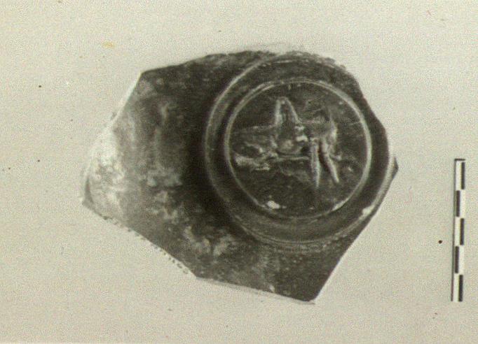 | Description: | A single fragment preserves the floor and a little of the wall of a bowl; very low ring foot; wall rounded as far as preserved. In center of floor a medallion made in two degrees; on the upper, in rather rough moulded relief, a large grasshopper or locust, right. Gray clay, black to gray glaze over all. Cf. Oliver (1977), p. 74, nos. 38, 39. (Silver for the Gods, Toledo Mus. of Art). | |